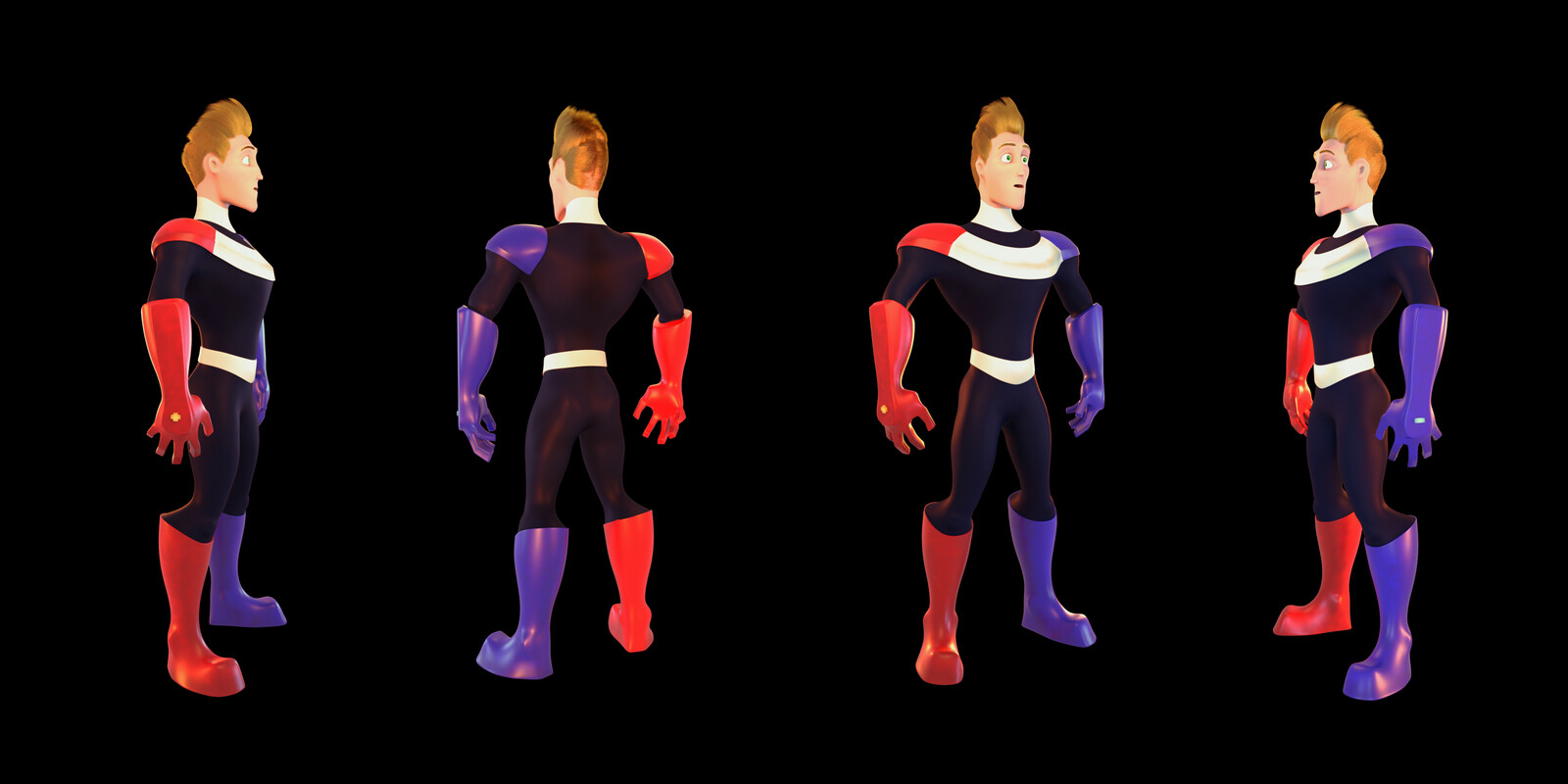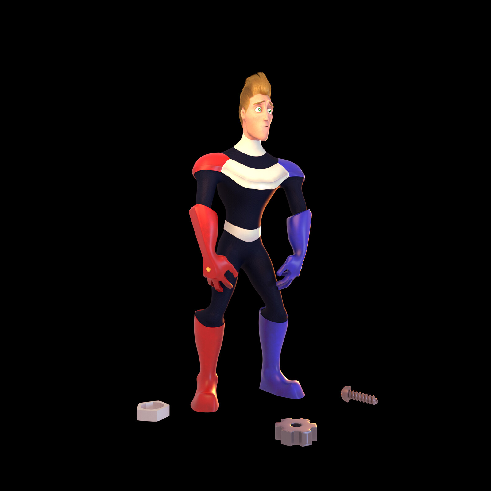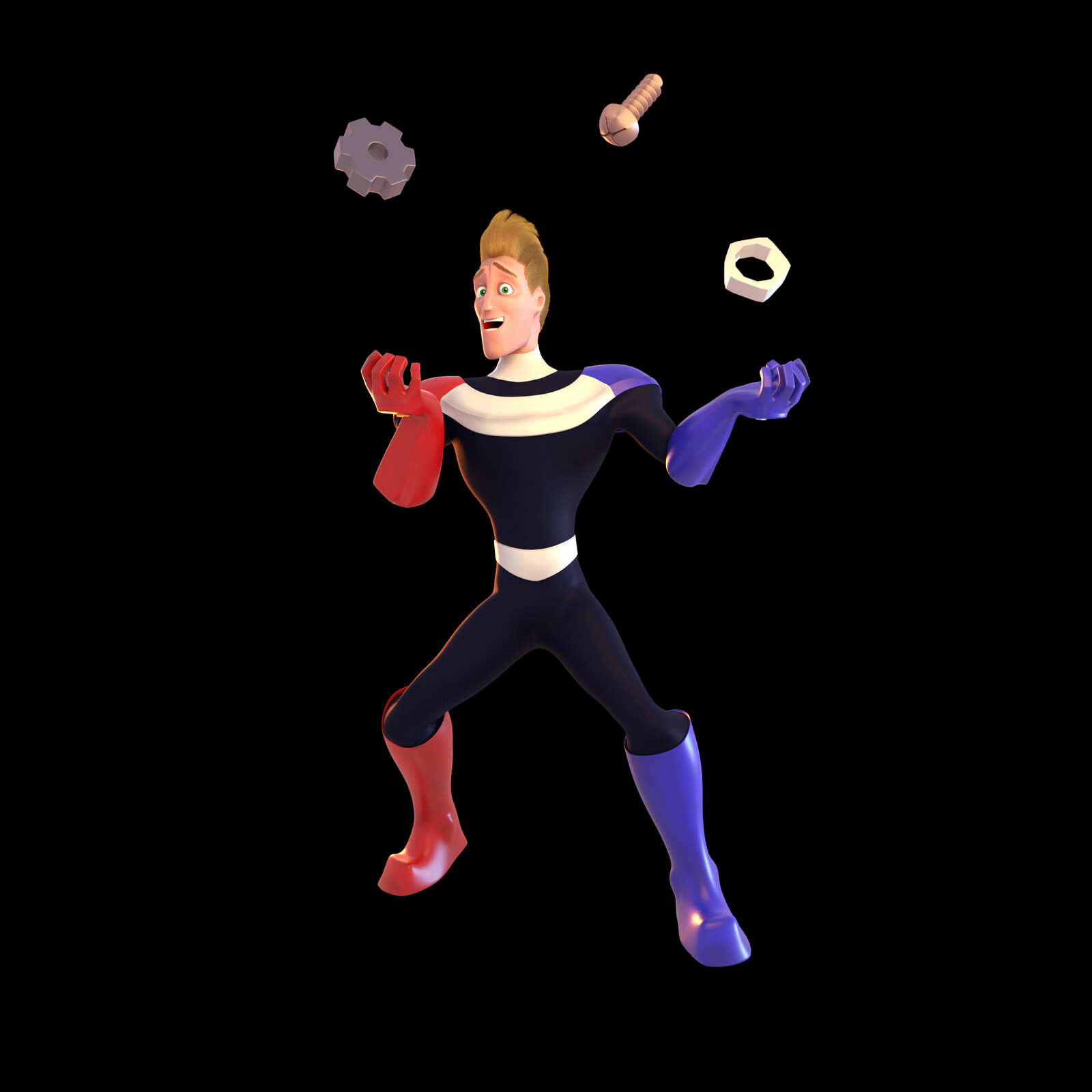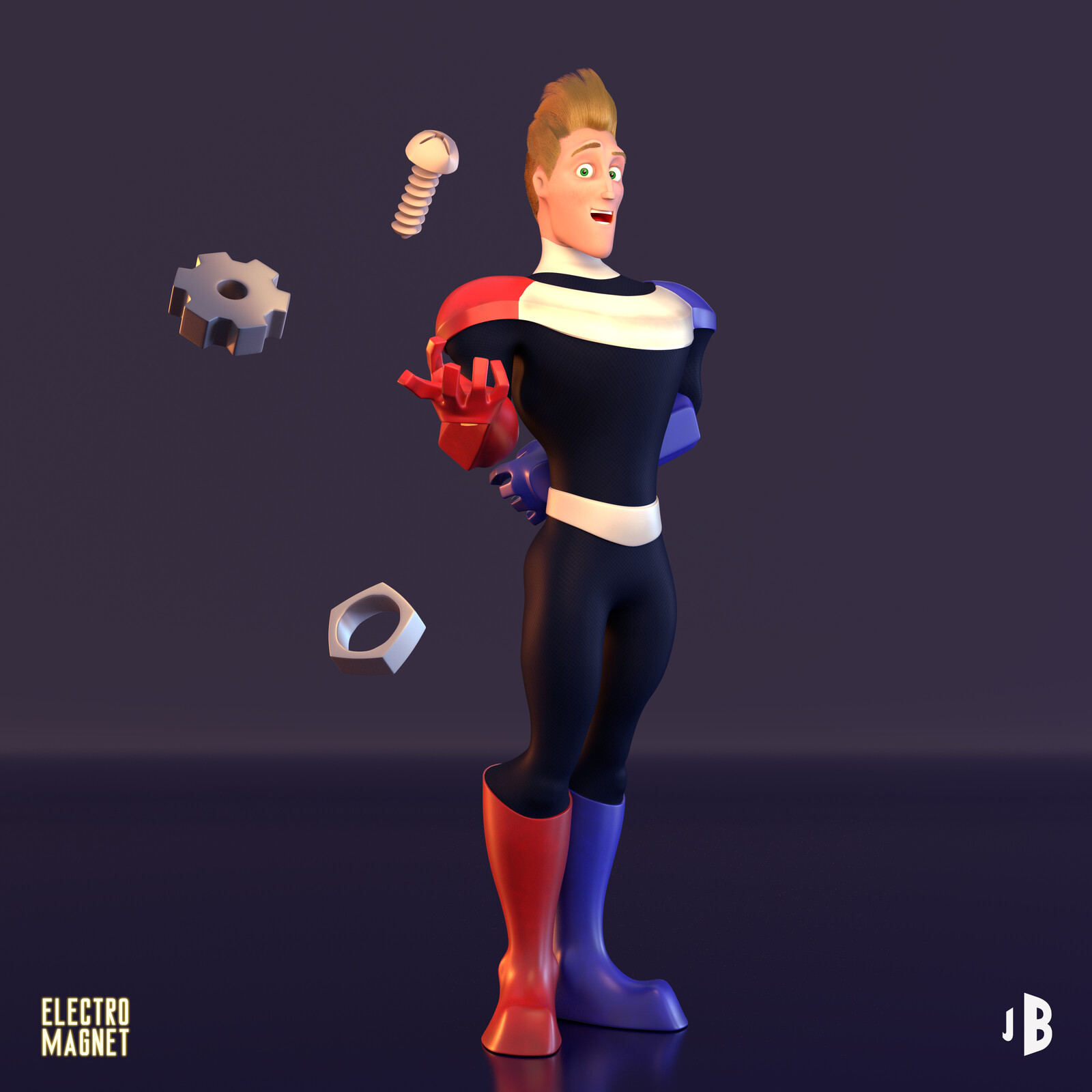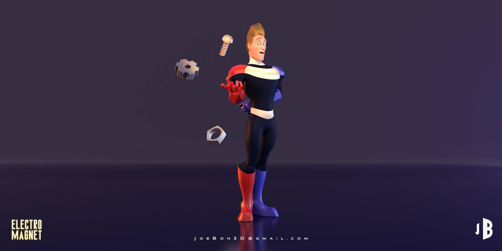 After finally getting a chance to see The Incredibles 2, I decided to create my own character in The Incredibles universe. Electro Magnet is a superhero character with magnetic powers, and I wanted to have his design speak that to viewers just by his look. His red and blue sides indicates his magnetic powers and his high rising hair shows that he is charged up and also resembles that of magnet powder being pulled up by a magnet.